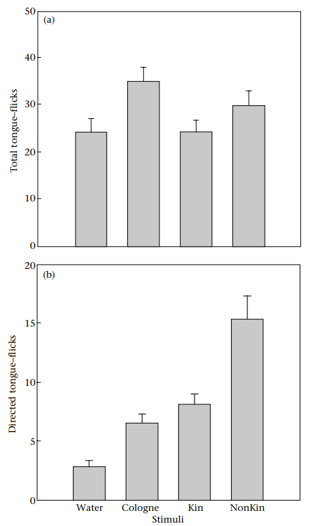 - Abstract: This study wanted to fill the gaps left in snake prey selection via chemoreception and wanted to investigate whether kin discrimination was present in a cannibalism practicing species. Pre-shedding the snakes showed less prey selection and post shedding showed higher response for non-siblings compared to kin, similar to their prey response. First evidence of kin selection in snakes and evidence on the method of recognition.