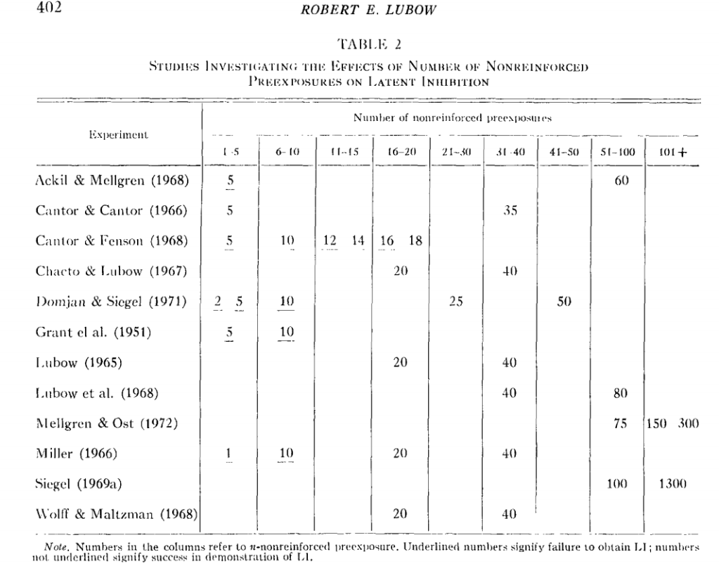 - Number of Pre-exposures: On average most studies use 5-80 non reinforced pre exposures, with the most typical being 20-40. Studies focused on the number of pre exposures have found there to be a significant inhibitory effect when giving stimuli for a narrow range of 16-20 with 5 studies showing significant effects across multiple species.