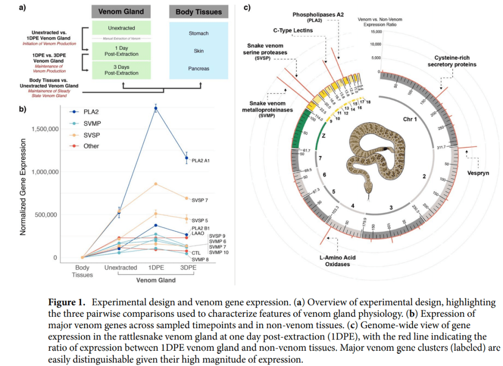 Timing and Variation in Snake Venom Gene Expression: After a bite, 1 day post bite the venom genes expression is significantly upregulated and is also upregulated at the 3 day mark. However there is a decrease in upregulation between days 1 and 3.