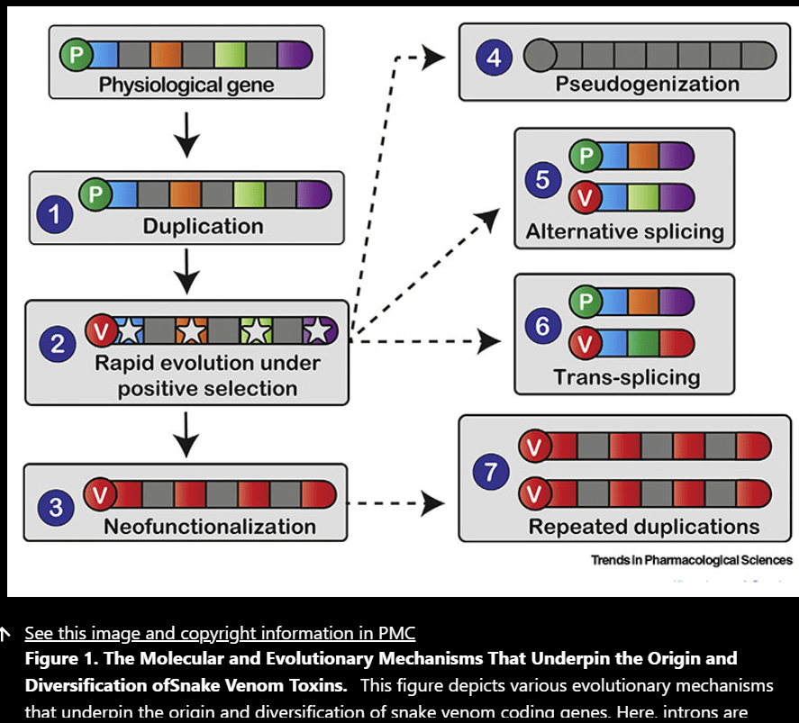 Numerous mechanisms have been proposed to explain the origin and diverse diversification of toxins which include: gene duplication, domain loss, evolutionary tinkering of expression levels, alternative and trans-splicing, and rapid evolution under positive Darwinian selection. Gene duplication mainly plays a role in phenotypic complexity and functional innovation which has been implicated in venom diversification. Repeated duplication events can cause some genes to undergo pseudogenization into dysfunctional forms and then deleted while others evolve new functions and are retained. Gene duplication can also alter the expression of genes other than just introducing novelty. Concerted evolution maintains high levels of sequence conservation in duplications even through recombination to increase expression of encoded types. This is not seen in snakes though. Domain loss is known to mediate toxin neofunctionalization.