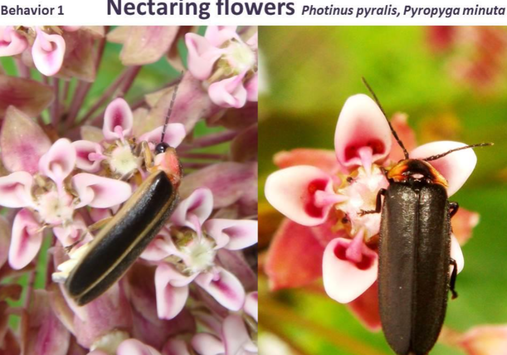 8 observed firefly species in north America (L. atra, P. pyralis, P. indictus, P. cooki, P. decipiens (and/or P. nigricans), P. minuta, Photuris sp. (possibly representing >1–3 species), and a Pyractomena sp.). But it seems that adult fireflies do engage in nectaring especially during the peak time of milkweed. The reason that this was not known before was because the times of peak activity normally was outside of the survey time range. The predatory femme fatale firefly was noted to have eaten most firefly species but rarely accepted a specific one (P. pyralis). This may mean that different species have different methods of accumulating the chemicals into their body making some species more preferable than others as prey.