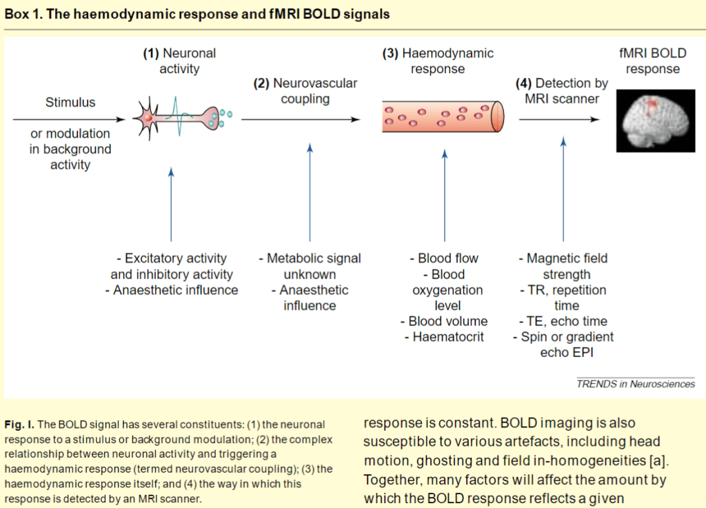 BOLD signal is affected by many variables like the use of different anesthetics which would affect metabolic and cellular activity. Neuronal activity linearly correlated with hemodynamic activity. Early reports suggested that action potentials and synaptic activity correlate with the BOLD signal and may contribute to it. However, recent evidence suggests that action potential activity of cortical cells only takes up 3% of resting energy consumption, thus is minimal even if doubled during activation. In terms of synaptic activity, most of energy and oxygen consumption occurs post activity and takes up to 95%. Therefore as expected synaptic activity is related to fMRI BOLD signals.