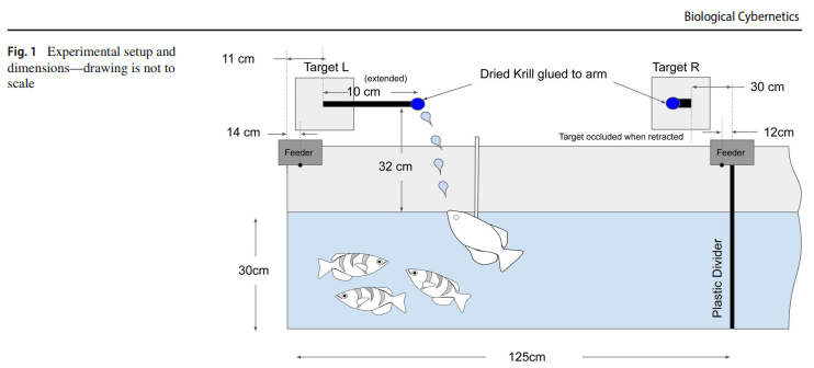 n= 3 banded archerfish were used for this experiment. 2 types of tests were done, the first was with food on an arm and the robot would engage in hunting behaviour but the food would not drop. The second type of test was when the food reward would drop to see whether this had an effect on their behaviour. Control trials were when the robot would ignore the arm when food was present. Check methods for in depth info on how robot movement was determined.