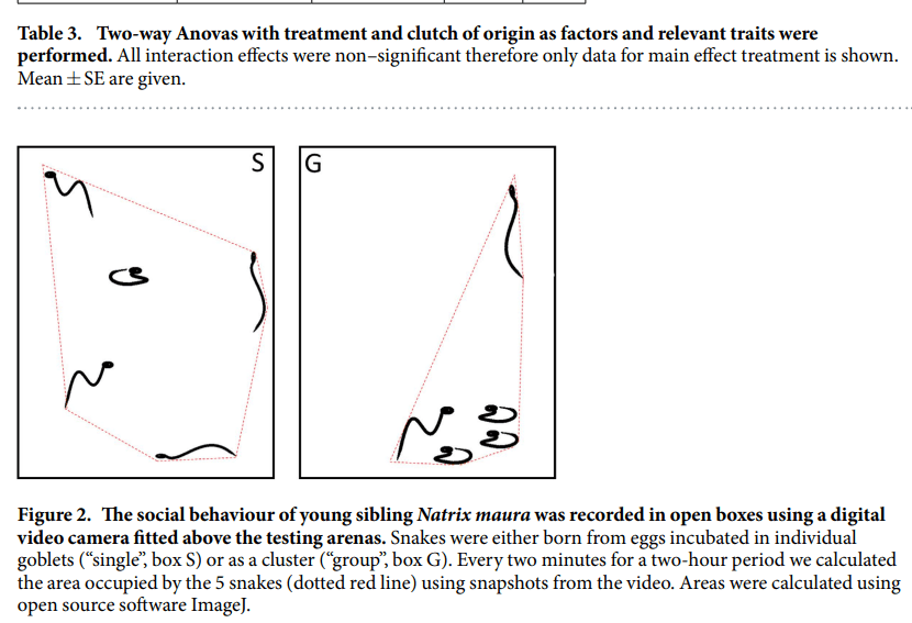 The hatchling size of snakes affected by treatment almost made significance, thus with higher sample sizes this may be seen at a larger scale with other reptiles. For other species, clustered eggs normally hatch larger than those alone. The fact that social behaviour was altered by this condition shows that clustering eggs may be critical to fostering social bonds prior to egg release. Other reptiles like anoles show social behaviours as soon they are released from their eggs and also engage in hatching synchrony, and iguana eggs were clustered they found that grouped eggs found the shortest distance to the mainland compared to single eggs. It seems this kind of trait is also present in water snakes and may have been facilitated by heart beat and hormonal odours. From the results of the open field they try to show that the snakes from the singly housed maybe exploring more and trying to escape b/c in their isolated egg form they had no communication from neighbours which may have signaled that the current environment is not hospitable. This leads to questions about egg welfare since most reptile hobbyists and breeders separate eggs to minimize risk of egg rot. However if there is communication occurring between eggs, this might be critical to social development, even in a typically asocial animal.