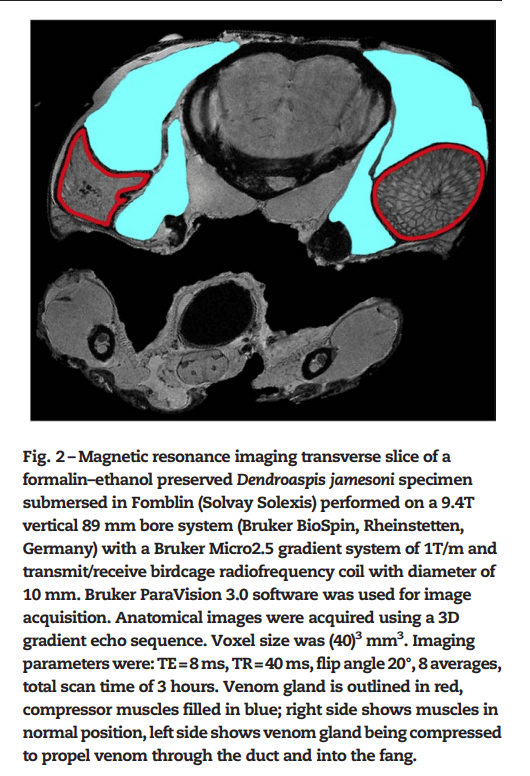 This paper takes a more detailed look at comparing the venom glands of different snakes by comparing their toxins, the highlight for my study is a figure they include showing the MRI images of various snakes. It seems like the differences between species is pretty clear visually at this resolution, I wonder if differences b/t individuals of the same species would be discernable as a result of treatment or if the changes resulting from a treatment will need a closer look.