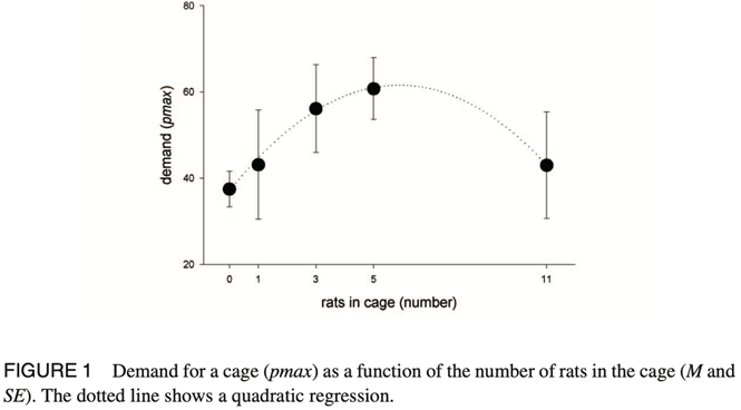 This study assessed rat preference in groups of 0, 1, 3, 5, or 11 cagemeates. The stocking density was held constant and the animals used a lever to access cage options. Based on previous studies, the highest demand for 3 or 5 cagements and lowest demand for 0, 1 or 11 was anticipated (Mattheews & Laedwig, 1994; Patterson-Kane, Hunt & Harper, 2002; Sherwin & Nicol, 1995).