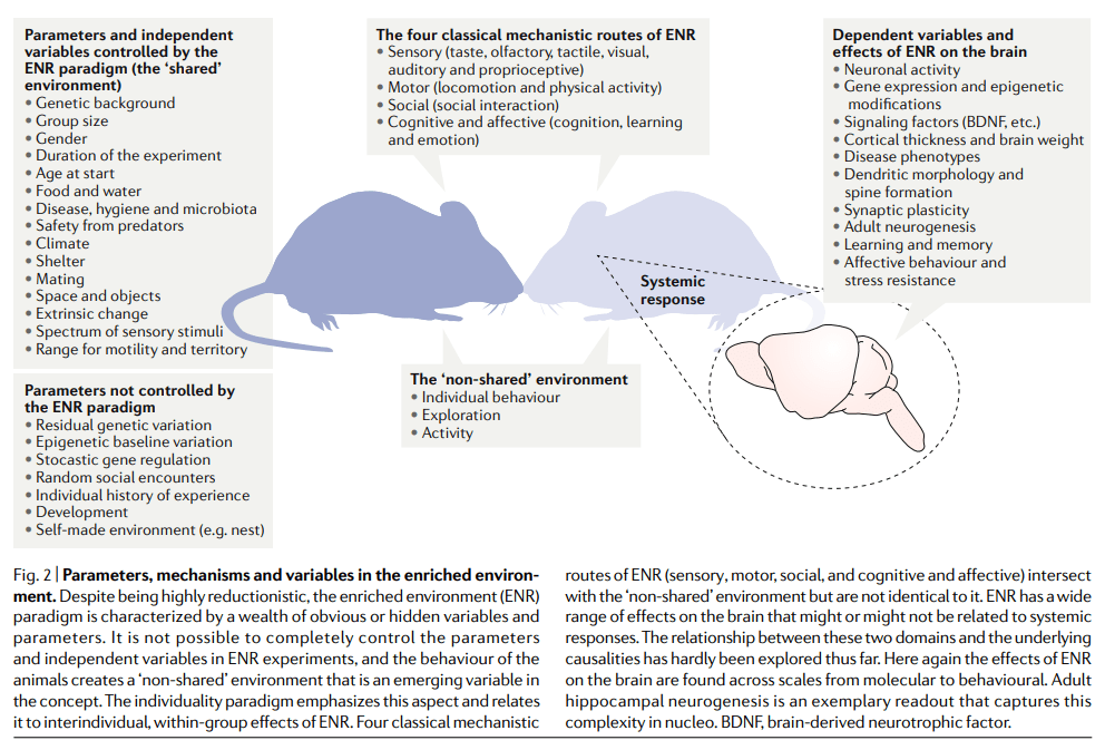 Environmental enrichment (EE or ENRs as stated in this paper) is basically known as a combination of inanimate and social stimulation. EE is hard to compare sometimes b/c so many studies used different set ups like keeping the cage size the same but changing the group size, or by only including toys or by using varying durations. However, even with all these variances in the procedure, we still get consistent results showing the effectiveness of enrichment in different contexts. Neurogenesis is a big component of EE and activity dependent regulation of neurogenesis means behaviours regulate growth of new neurons which can change aspects of future behaviours in turn regulating growth of neurons, hence closing the feedback loop.