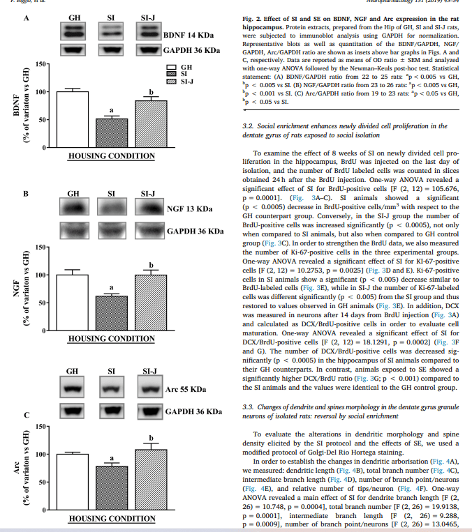 - Social Isolation induces decrease of BDNF, NGF and Arc expression in the rat hippocampus: reversal by social enrichment = BDNF, NGF and Arc protein was observed using immunoblot analysis, there was a significant reduction in all of these parameters when isolated. Then there was a significant increase in all of these parameters when they were returned to social enrichment, these values were similar to the subjects who were group housed from the beginning.
