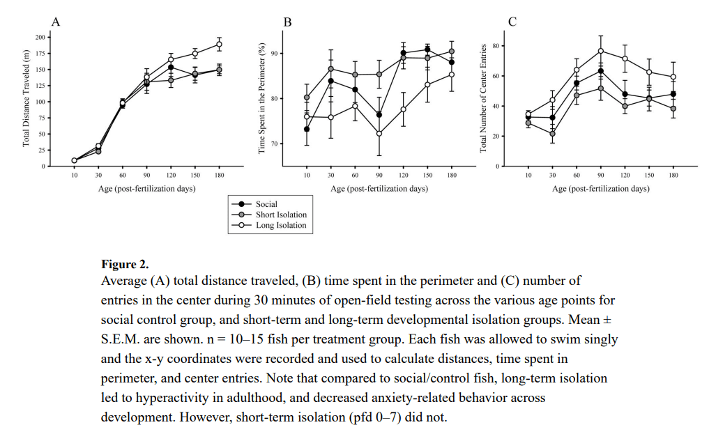 - Long term isolation on behaviour – This was found to cause hyperactivity which was seen with the more distance traveled. Similar findings were observed in rats, and early isolation with rats also induced behavioural impulsivity in adults. In rodents, social isolation also elevates anxiety, however in zebrafish they found that it actually reduced anxiety along different measures. I believe this is because of social environment matching, where the social isolation is actually very similar to the open field test which may have resulted in reduced anxiety. Another study showed that long term isolation in zebrafish did not affect cortisol levels, indicating it may not be stressful.