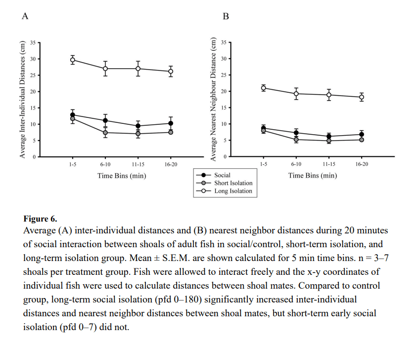 - Social isolation on shoaling – Shoal cohesion was significantly reduced in long isolated groups and they were very far from neighboring fish compared to other treatment groups