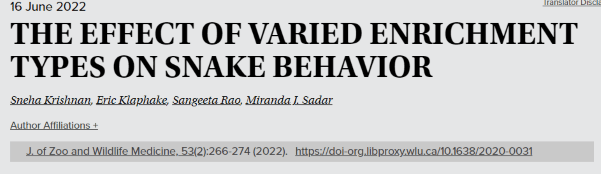 THE EFFECT OF VARIED ENRICHMENT TYPES ON SNAKE BEHAVIOR – Krishnan et al., 2022 Abstract: 18 species of snakes from 2 families of colubridae and pythonidae were exposed to 4 types of enrichment consisting of humid hide, olfactory, climbing and suspended hide. Baseline observations and observations for 2hrs post introduction were conducted, there was noContinue reading “How not to do a snake enrichment study -_-“