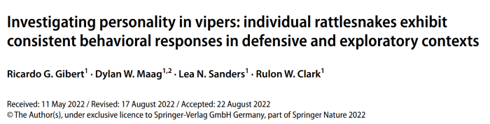 Investigating personality in vipers: individual rattlesnakes exhibit consistent behavioral responses in defensive and exploratory contexts – Gibert et al. 2022 Abstract: This paper looks at personality in 20 captive Western rattlesnakes using 5 repeated trials including a handling assay, an open field test and a threat assay. They found that certain behaviours related to exploration,Continue reading “Personality found in rattlesnakes”