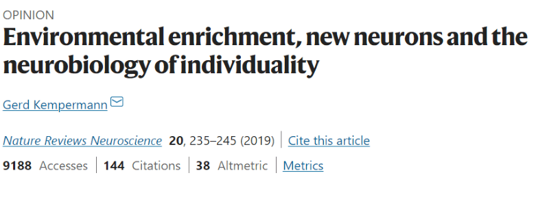 Environmental enrichment, new neurons and the neurobiology of individuality – Kempermann, 2019 Introduction: Environmental enrichment (EE or ENRs as stated in this paper) is basically known as a combination of inanimate and social stimulation. EE is hard to compare sometimes b/c so many studies used different set ups like keeping the cage size the sameContinue reading “Environmental Enrichment in Neuroscience – A review”
