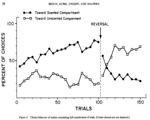 Conditioned Discrimination of Airborne Odorants by Garter Snakes – Begun et al. (1988) Abstract- Garter snakes were trained via food rewards to discriminate between two biologically irrelevant scents. The first experiment was a 2 sided compartment and the second was a 2 sided maze, in both the snakes showed the ability to discriminate correctly. 4Continue reading “Snakes and Novel Scent Recognition”
